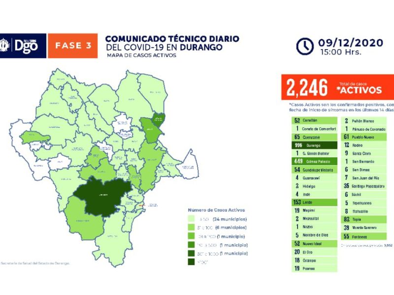 Este miércoles se registró un ligero repunte de casos activos pues se pasó de 2 mil 143 a los 2 mil 246 pacientes en el estado, aunque solo en el municipio de Durango se pasó de 949, reportado el martes, a los 996 casos reportados este miércoles.
