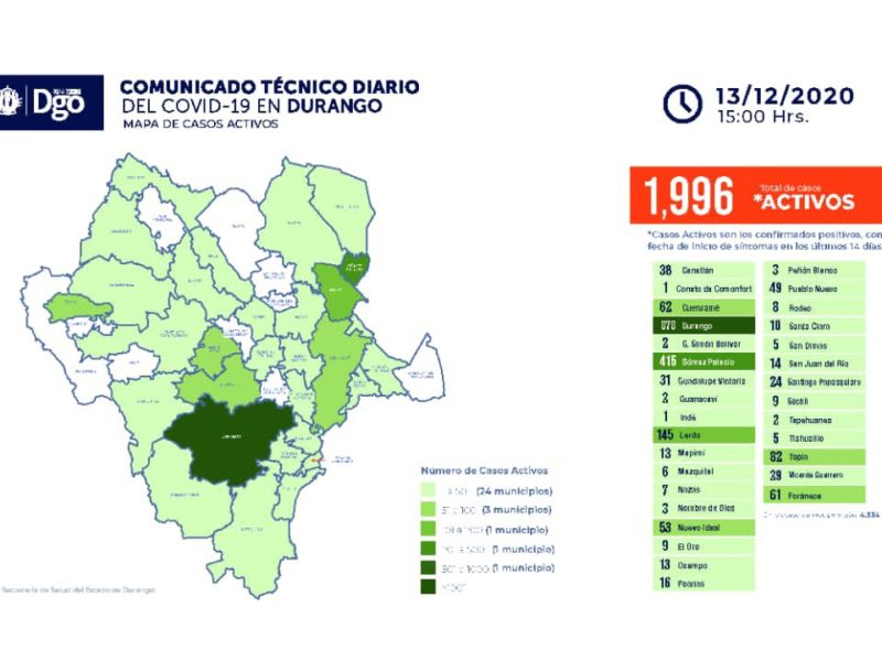 Hasta este domingo, se reportan en el estado mil 996 casos activos de Covid-19, de los Durango concentró 878 pacientes, Gómez Palacio 415, Lerdo 145, Topia 82 y Cuencamé 62 casos.