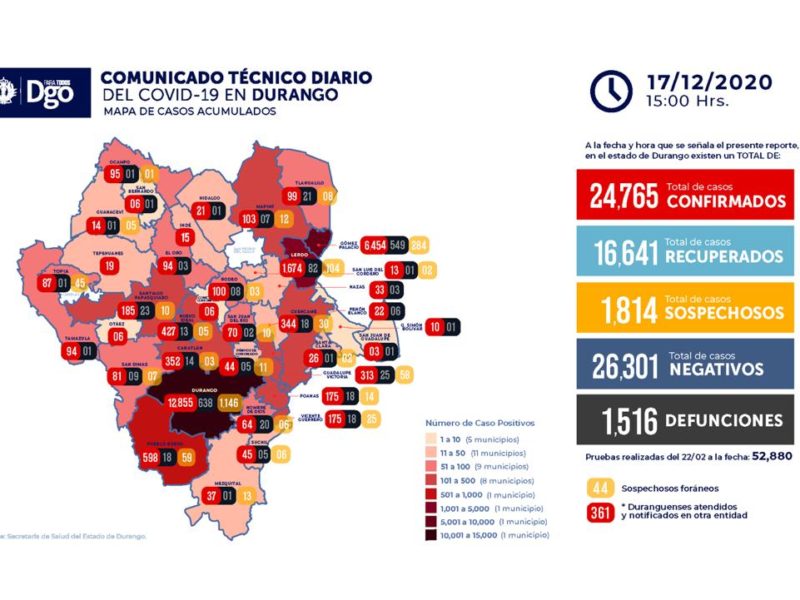 En Nuevo Ideal fueron cinco casos, mientras en Rodeo y Lerdo fueron cuatro casos, en Vicente Guerrero dos casos, y en los municipios de Cuencamé, Nombre de Dios y Santa Clara un caso respectivamente.