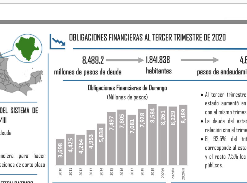 El estado de Durango reportó al tercer trimestre del 2020 obligaciones financieras por 8 mil 489.2 millones de pesos, cifra que incluyó los compromisos financieros de los 39 municipios, por lo que la deuda del estado aumentó 3.8 por ciento en comparación con el mismo trimestre del 2019.