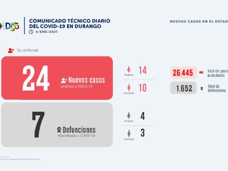 Además, detalló que de los 24 nuevos casos confirmados, 20 residen en Durango, mientras que en Canatlán, Guadalupe Victoria, Pueblo Nuevo y Santa Clara reportaron un caso por demarcación.