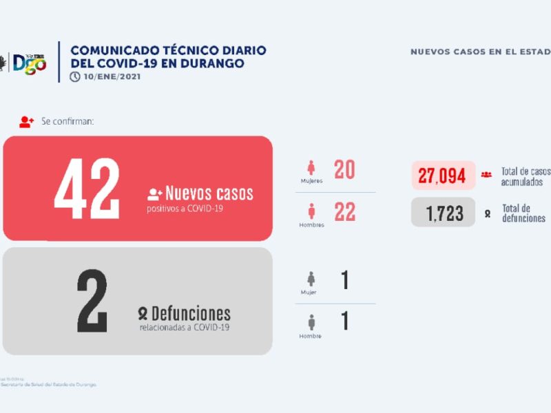 De los 44 nuevos casos 20 son mujeres y 22 son hombres, de los que 27 reportaron residir en Durango, cinco en Gomez Palacio, tres en Lerdo y dos en Cuencamé, mientras que Canatlán, Guadalupe Victoria, Nuevo Ideal, Rodeo y San Dimas reportaron un caso respectivamente.