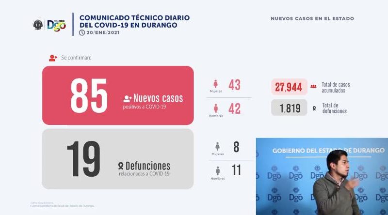 Hasta 85 nuevos casos de Covid-19 se confirmaron este día para acumular 27 mil 944 personas contagiadas, además de reportarse 19 nuevos decesos para acumular mil 819 fallecimientos provocados por el nuevo coronavirus. Fernando Ríos, vocero de la Secretaría de Salud del Estado de Durango detalló que de los 19 decesos registrados este día ocho son mujeres y 11 hombres, de los que ocho tenían residencia en Durango, seis en Gómez Palacio, dos Canatlán, así…