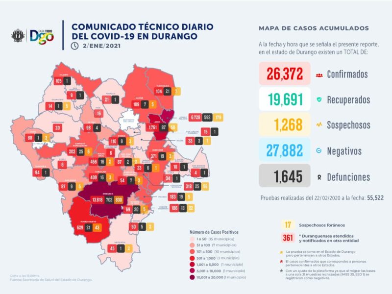 "En Durango detonamos la economía con nuevas obras: Aispuro"Por segundo día consecutivo, autoridades de salud del Estado de Durango no reportaron decesos por COVID 19, aunque se confirmaron 49 nuevos casos del nuevo coronavirus. Así, Durango acumula 26 mil 461 contagios de Covid-19, además de mantener por segunda ocasión en las últimas 48 horas mil 645 decesos provocados por el virus surgido en China. De los 49 nuevos casos, 27 correspondieron a mujeres y 22 hombres, de los cuales 24 tienen residencia en…