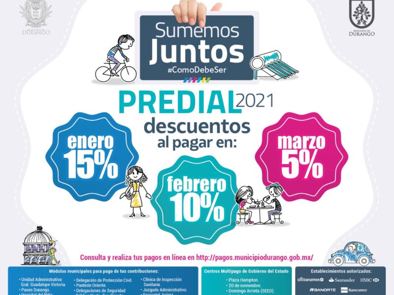 "En el 2021 seguiremos avanzando: Aispuro"El Gobierno Municipal, lanza la campaña a petición de Jorge Alejandro Salum del Palacio, en su calidad de Presidente Municipal denominada “Sumemos Juntos”, que inicia este primero de enero al 31 de marzo del 2021, con la finalidad de incentivar el pago del Impuesto Predial de este año, otorgando para ello descuentos en el pago por anualidad. Esta campaña ofrece descuentos del 15, 10 y 5 por ciento durante los meses de enero, febrero y…
