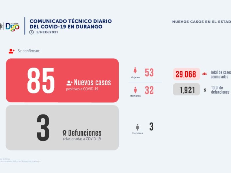 Durango registró en las últimas 24 horas 85 nuevos casos de Covid-19, con los cuales la entidad acumuló 29 mil 068 personas contagiadas por el nuevo coronavirus que provocó este día 3 decesos más para sumar a la fecha mil 921 defunciones.
