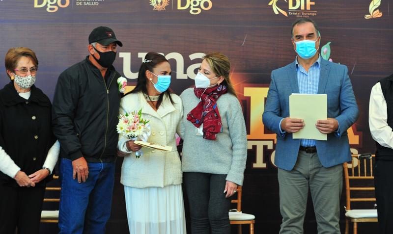 Una boda para todos es un esfuerzo del Gobierno del Estado a través del DIF Estatal para afianzar el desarrollo integral de las familias al proveer de certeza jurídica a los grupos familiares que integran la sociedad duranguense, por ello, a pesar de la contingencia, este tipo de programas en beneficio de todos, siguen adelante, agregó la subdirectora del Registro Civil, Ixchel Alvarado quien junto al alcalde Jorge Salum del Palacio y la directora de DIF, Rocío Manzano Chaidez, también fue testigo de los nuevos matrimonios.