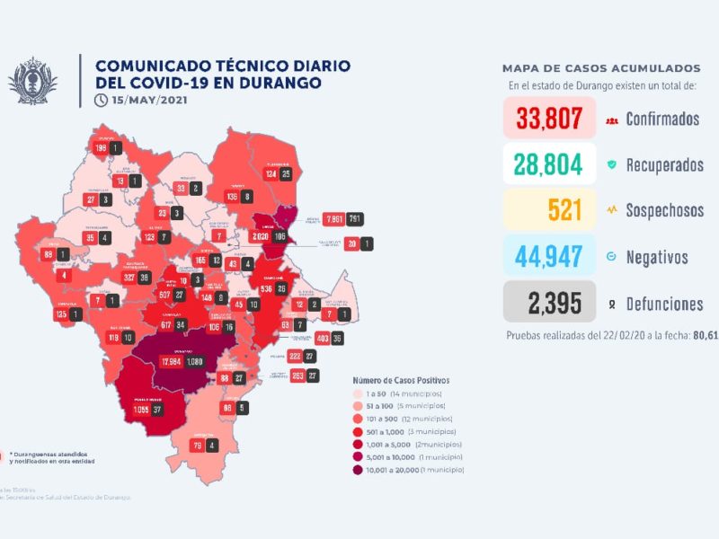 Hasta este 15 de mayo suman 33 mil 807 personas contagiadas por Covid-19 en el estado de Durango, de los que 2 mil 395 han perecido víctimas de la enfermedad, no obstante han superado la enfermedad hasta 28 mil 804 duranguenses y 44 mil 947 han dado negativo a la prueba.