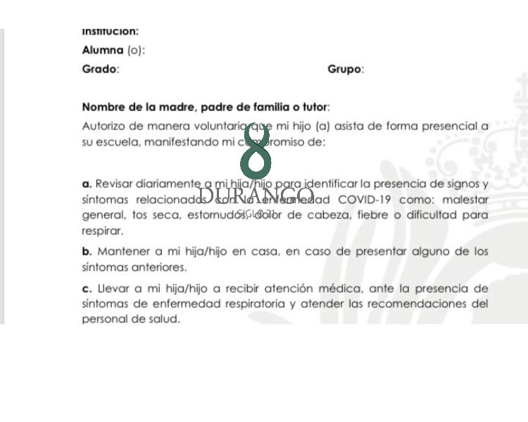 Los padres de familia tendrán que firmar una carta compromiso de corresponsabilidad, en donde se comprometen a revisar diariamente a sus hijas e hijos para identificar la presencia de signos y síntomas relacionados con la enfermedad Covid-19.