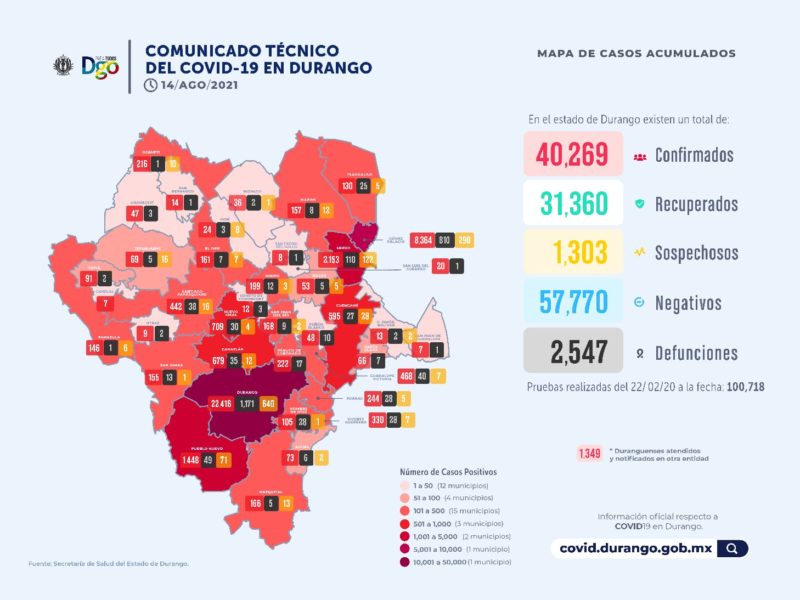 A diferencia de lo que ocurrió al principio de la pandemia en el estado, cuando Gómez Palacio era el foco de infección, ahora el municipio de Durango concentra los contagios a grado que acumula 22 mil 416 con mil 171 decesos, mientras que Gómez Palacio contabiliza 8 mil 364 contagios con 810 defunciones.
