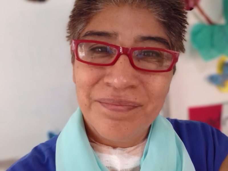 En el mes de mayo de este año se le diagnosticó el cáncer de tiroides y, al no contar con seguro de salud, su familia apoyó para los gastos de todos los estudios y análisis en la primera etapa, gracias a que su esposo cuenta con Seguro Social pudo ser intervenida en el mes de agosto en donde gracias a su cirujano pudo salvarle la voz, que en el panorama más alarmante era que podía perderla.