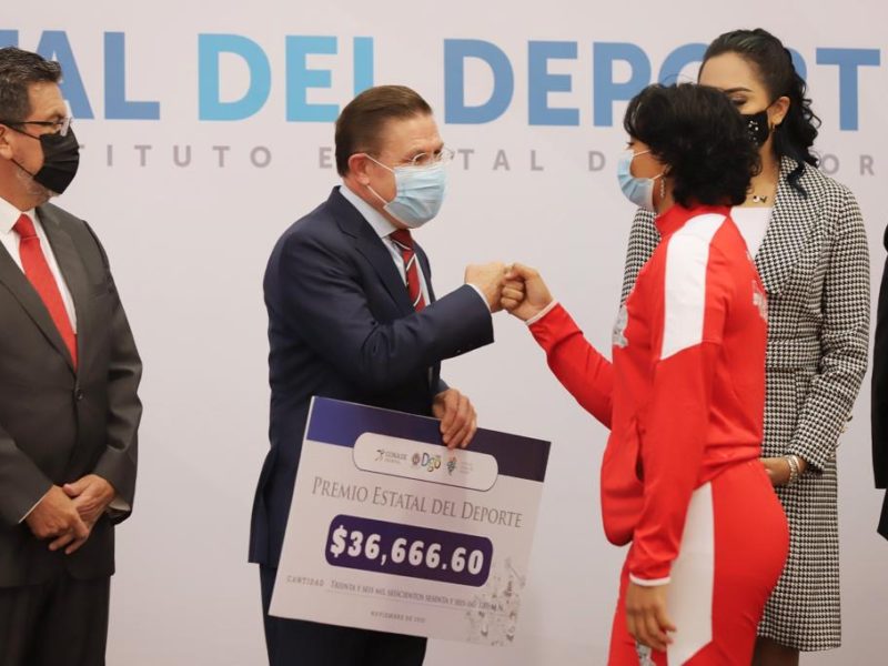 Esta edición 2021 del Premio Estatal del Deporte, es la mejor ocasión para reconocer el mérito de las y los duranguenses más destacados, expresó el Gobernador al otorgar junto a la directora del Instituto Estatal del Deporte, Anakaren Ávila Ceniceros, la máxima distinción a Deborah Marín Palomares de físico constructivismo, Michelle Alejandra Lizárraga González de Voleibol y Anahí Álvarez Corral de triatlón, siendo ésta última quien a nombre de las galardonadas, agradeció el apoyo que los deportistas duranguenses han recibido durante la actual Administración Estatal