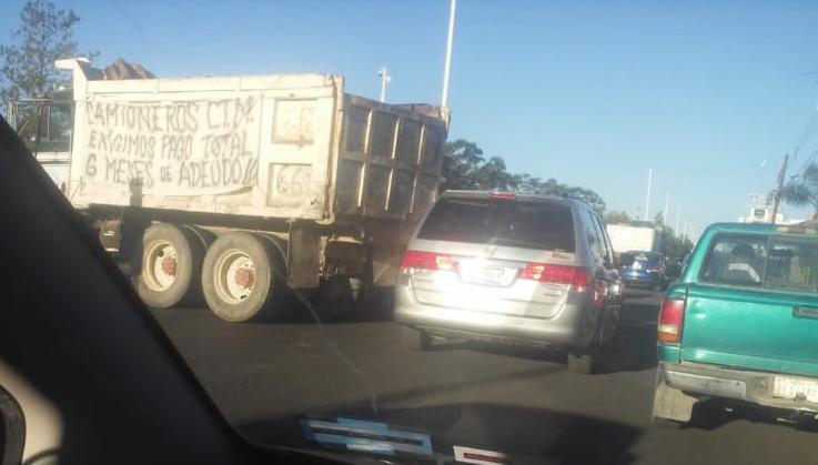 Con camiones volteo atravesados sobre los alguno de los carriles del bulevar, los transportistas señalan a la empresa constructora de la obra del puente vehicular de haber dejado de pagar desde hace seis meses por lo que exigen se cumplen con los recursos.