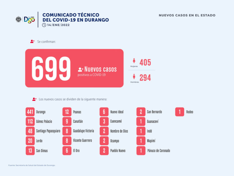 Autoridades sanitarias de Durango informaron que en las últimas 24 horas se confirmaron 699 nuevos casos de Covid-19, una cifra sin precedente desde que inició el reporte de casos en el estado de Durango en marzo del 2020.