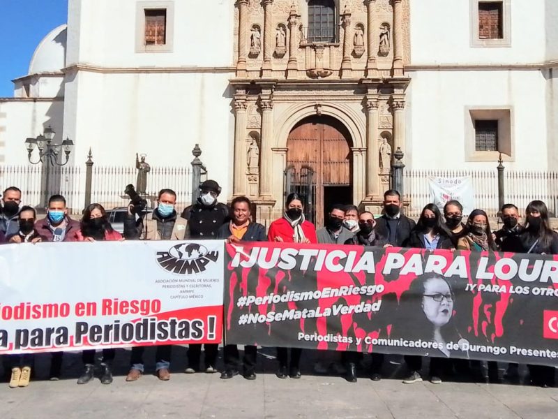 Los dirigentes fueron acompañados por decenas de periodistas duranguenses, quienes también se sumaron a la exigencia de evitar la retórica de las autoridades sobre el esclarecimiento de los crímenes que han dictado afectado a los comunicadores en el país.