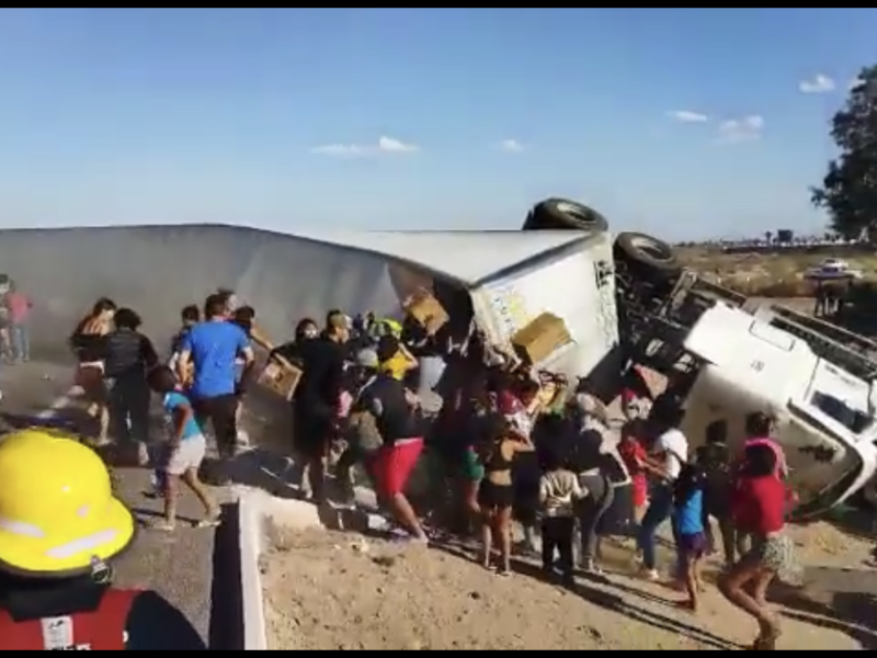 Volcó un tráiler en el Ejido El Fénix, en Gómez Palacio, Durango; la unidad transportaba diversos productos, mismos que fueron tomados por los habitantes de la zona, en un acto de rapiña