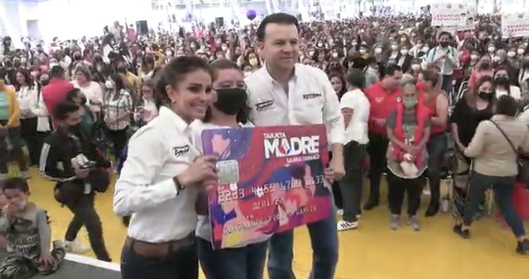 Ante una gran cantidad de mujeres reunidas en el polideportivo del parque Guadiana, Esteban Villegas y su esposa Marisol Rosso presentaron la «Tarjeta madre, salario Durango», mediante la cual se pretende desplegar beneficios para las mujeres en materia de servicios de salud, estancias infantiles, atención psicológica y hasta salarios para amas de casa.