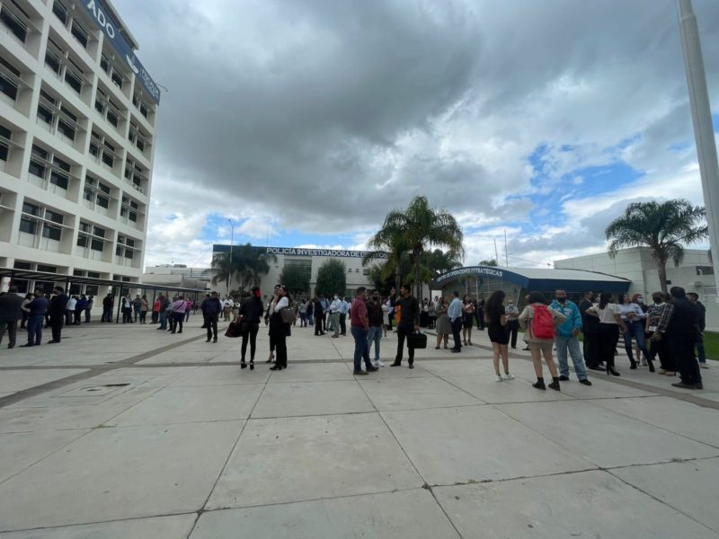 Personal de la Coordinación Estatal de Protección Civil acudió a la Fiscalía General del Estado para realizar algunas inspecciones en el edificio, en tanto que el personal se retiró de manera inmediata de los edificios que conforman la dependencia, la cual consta de dos torres de aproximadamente 10 pisos, así como la sede de la policía investigadora del delito, que solo tiene una planta.