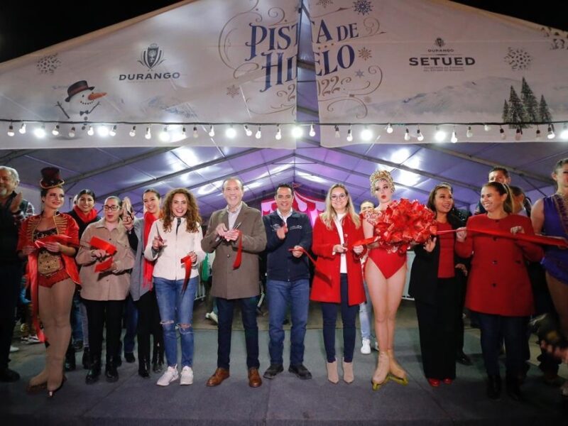La pista de hielo y la Villa navideña instalada en la Plaza IV Centenario fue inaugurada por el presidente, Toño Ochoa y el Secretario General de Gobierno, Héctor Vela.