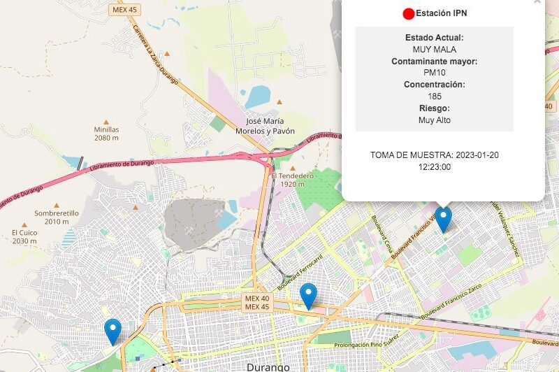El Sistema de Monitoreo de la Calidad del Aire del Estado de Durango reportó durante este mediodía una muy mala calidad de ambiente en la zona aledaña a la representación del Instituto Politécnico Nacional.