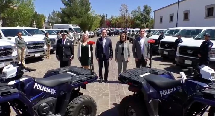 En el evento se hizo la entrega de 38 patrullas, dos motos, 250 radios y cuatro antenas de comunicación: una para el municipio de Pueblo Nuevo, otra para Santiago Papasquiaro, la comarca lagunera y la capital, en una acción que beneficia tanto a la Secretaría de Seguridad Publica como a la Fiscalía General del Estado.