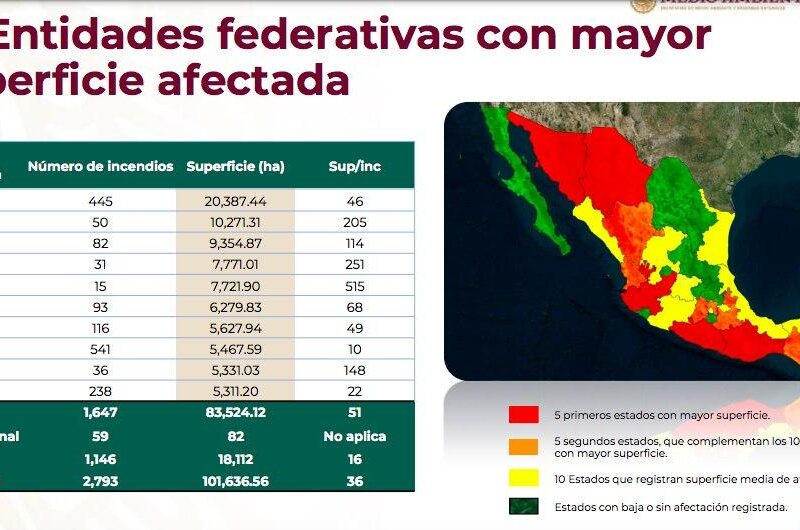 El estado de Jalisco ocupa el primer lugar en cuanto a superficie impactada por los incendios con poco más de 20 mil hectáreas, mientras Oaxaca reporta poco más de 10 mil hectáreas dañadas y Chihuahua poco más de 9 mil.