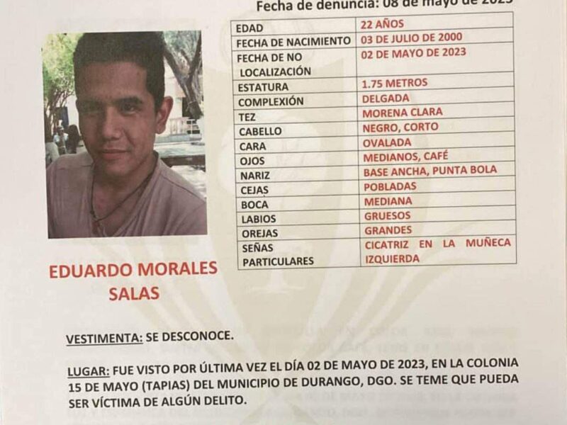 El joven Eduardo Morales Salas, de 22 años de edad, ha sido reportado como desaparecido desde el pasado 2 de mayo de 2023. Según la información disponible, Eduardo trabajaba en un aserradero o en el área de albañilería antes de su desaparición y fue visto por última vez en la colonia 15 de mayo.