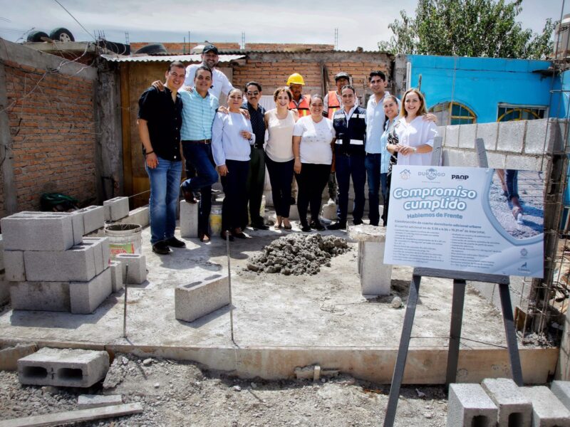 En él fraccionamiento San José, arrancó la construcción de cuartos adicionales que fueron solicitados por las familias en el programa Hablemos de Frente, acción celebrada con emotividad por jefas de familia como Rosa Salomé Núñez, quien junto a sus hijos vivía en un solo cuarto.