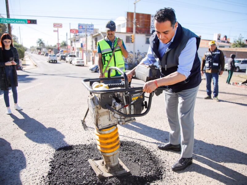 Avenida Ferrocarril es una de las áreas atendidas con la campaña de rehabilitación de calles permanente: “Dale, Dale con el Bache”, afirmó Toño Ochoa al verificar los trabajos de la Dirección de Obras Públicas, para responder a esta necesidad ciudadana.