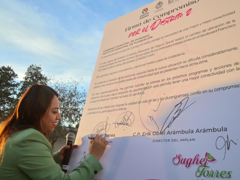 La diputada local priista Sughey Torres Rodríguez firmó un compromiso para atender una de las principales demandas del distrito 2 de Durango: mejorar la vialidad hacia la Clínica 50 del IMSS. En una reunión con funcionarios municipales y estatales, la legisladora destacó que este proyecto busca facilitar el acceso a los servicios de salud para las familias de la zona.