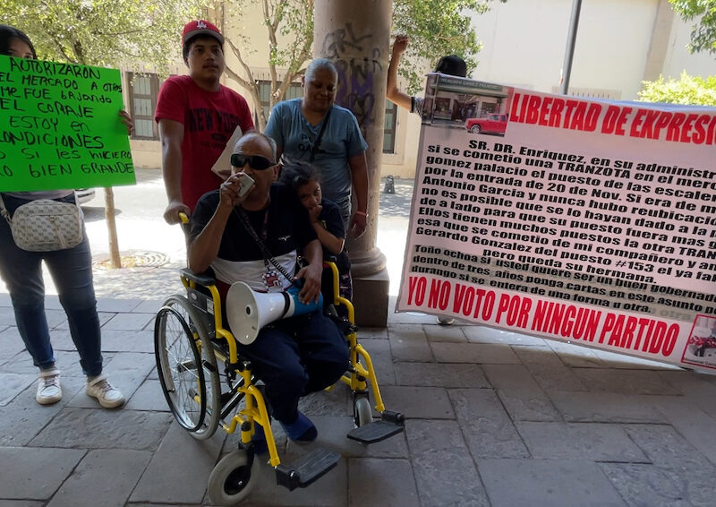 Al quitar escaleras en el mercado Gómez Palacio fueron eliminados dos puestos, uno de los cuales perteneció al papá del comerciante, Antonio García, quien ayer salió a la calle una vez más a demandar la restitución de su espacio que se le quito en la administración de José Ramón Enríquez en 2016.