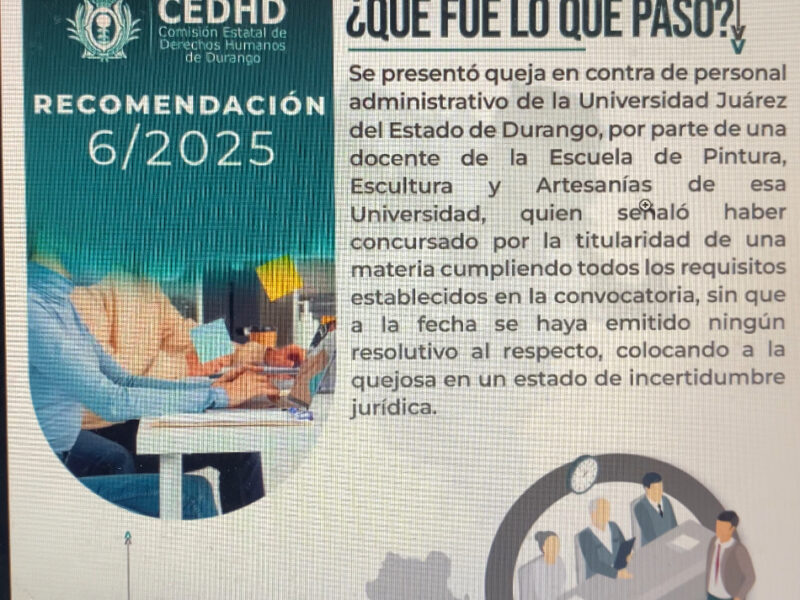 Las recomendaciones se dirigieron a diversas instituciones públicas: dos al Colegio de Bachilleres, dos a la Secretaría de Educación, una a la Dirección de Seguridad Pública Municipal y una más a la Universidad Juárez del Estado de Durango (UJED).