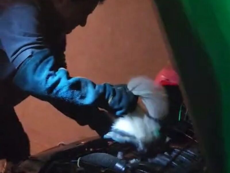 Una familia del fraccionamiento Milenio 450 realizó una llamada a la línea verde de la Policía Ambiental al detectar que un animal se había introducido en su vehículo. Elementos de la corporación acudieron al lugar y encontraron un zorrillo atrapado bajo el tanque de agua del motor.