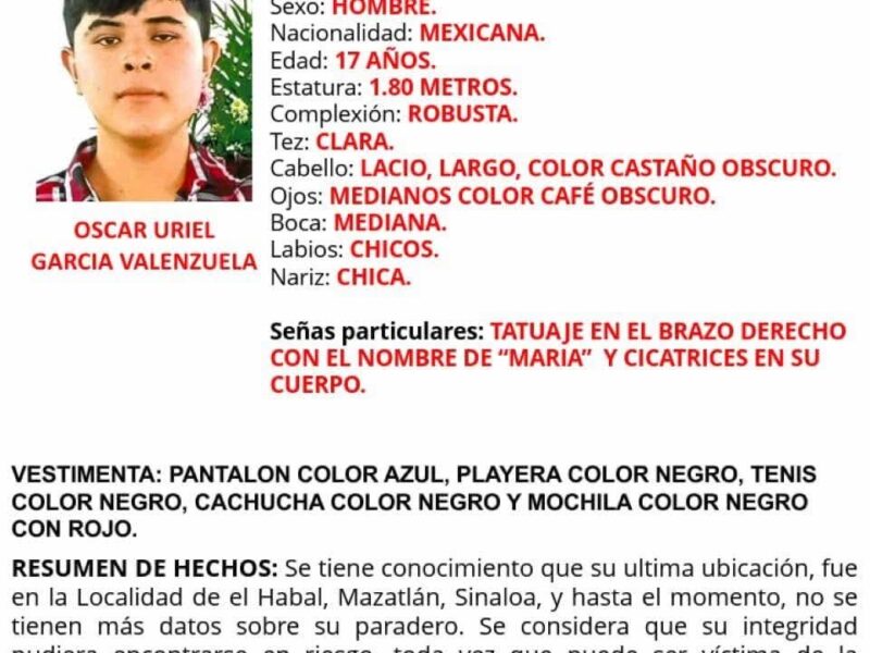 Oscar Uriel Garcia Valenzuela de 16 años de edad desapareció en la ciudad de Durango el 31 de octubre del 2024 y su última ubicación fue en Sinaloa y la Alerta Amber apenas fue activada este 12 de diciembre del 2024, señaló su madre