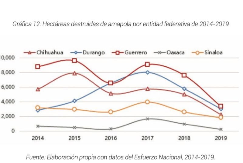 "Destruye Sedena 7 Mil Plantíos, Mayoritariamente de Amapola: Gómez Magaña."En los dos primeros años del gobierno federal encabezado por Andrés Manuel López Obrador, la destrucción de plantíos de amapola disminuyeron drásticamente en el estado de Durango, según un reporte de la propia autoridad federal. Hasta el 2018 el gobierno de la República reportó la destrucción de casi 6 mil hectáreas de marihuana en el Estado Durango, mientras que un año después se reportó alrededor de 3 mil hectáreas destruidas. De acuerdo a la estadística…