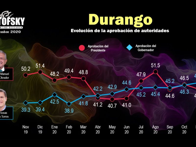 "En Noviembre Gobernador Superó a Presidente en Aprobación de Duranguenses: Mitofsky."Prácticamente empatados en el nivel de aprobación quedaron el presidente Andrés Manuel López Obrador y el Gobernador José Aispuro Torres en el sondeo de opinión correspondiente a octubre, cuyos resultados se revelaron en días pasados por Consulta Mitofsky. El presidente López Obrador contó con un 46.5 por ciento de aprobación, mientras que el Gobernador Aispuro Torres quedó con un 46.3 por ciento, una diferencia de apenas el .2 por ciento, lo que se considera un…