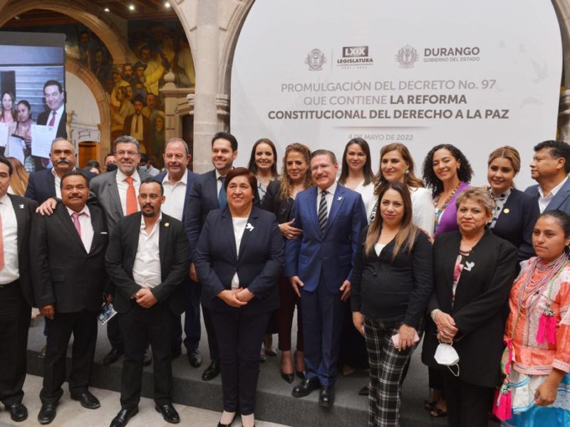 "Pretende PAN Reforma Constitucional para Impedir Candidaturas de Agresores de Mujeres"El derecho a la paz quedó promulgado en la Constitución General del estado, luego de que se emitió su promulgación por parte del gobernador José Aispuro Torres, quien firmó el decreto número 97 que contiene dicha reforma. El ejecutivo estatal encabezó una ceremonia en donde se dio a conocer la promulgación de la reforma, misma que propició la visita de Francisco Javier Rivas Rodríguez, director del Observatorio Nacional Ciudadano. “Hoy Durango es referente en resultados…