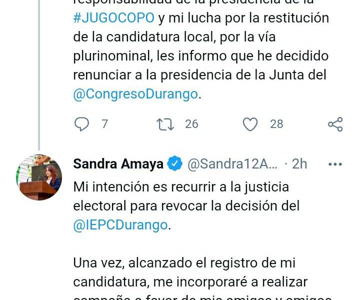 "Confirma Amaya Renuncia, Busca Registro como Candidata con Impugnación."A través de una publicación en Twitter, la diputada Sandra Amaya informó acerca de su renuncia a la Junta de Coordinación Política en el Congreso del Estado, y que buscará restituir su candidatura local por la plurinominal. La legisladora escribió: “Con la finalidad de no interferir entre la responsabilidad de la presidencia de la #JUGOCOPO y mi lucha por la restitución de la candidatura local, por la vía plurinominal, les informo que he decidido renunciar…