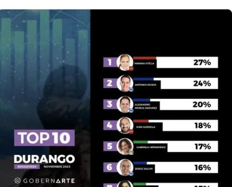 "Caen Actos de Corrupción en Durango; Pasa de 4 a 10 Lugar: INEGI"La encuestadora GoberArte SC detectó que la ex candidata a gobernador de Morena, Marina Vitela encabeza las preferencias electorales entre ciudadanos consultados sobre la candidatura al Senado de la República con un 27 por ciento de personas que considera que será la candidata de su partido. En un segundo lugar se encuentra el presidente municipal de Durango, Toño Ochoa, quien alcanza un 24 por ciento de personas que creen que sería candidato al senado por…