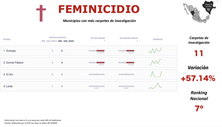 "Lamenta Arzobispo Feminicidio de “Lupita”; Justicia Puede ser Camino de Consuelo."Durango ocupa el séptimo lugar a nivel nacional en feminicidios, pues en ocho meses creció un 50 % , señaló Elier Flores, presidente del Observatorio Ciudadano, quien enfatizó que Gómez Palacio y Durango son los municipios con más casos registrados. Al hacer un balance en materia de seguridad del presente año, Flores hizo énfasis en hacer mención de las agresiones contra mujeres duranguenses pues consideró que la autoridad debe de enfocar sus acciones para disminuir…