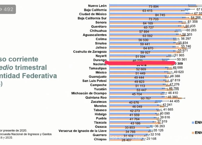 Durango se convirtió en el último estado en el norte del país en los montos de ingresos y egresos de forma mensual, según la Encuesta Nacional de Ingresos y Gastos de los Hogares 2022, que levantó Inegi. De esa manera, Durango reportó ingresos por 19 mil 100 pesos de manera mensual en sus hogares, mientras que Baja California Sur reporto 30 mil 500 pesos en ingresos, seguido por Baja California con 29 mil 600 pesos…