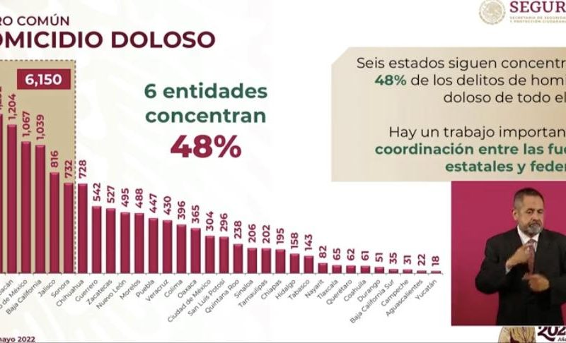 "Durango, Séptimo Lugar con Menos Homicidios Dolosos en el País en Primer Bimestre."En los primeros cinco meses del año, Durango acumuló 81 homicidios dolosos, lo que lo ubicó en el octavo lugar nacional entre las entidades con menor incidencia de dicho delito en el país, según los datos expuestos en la conferencia matutina del presidente Andrés Manuel López Obrador. Rosa Icela Rodriguez, Secretaria de Seguridad Pública del Gobierno Federal, presentó durante la mañana de este lunes la estadística sobre homicidios dolosos por entidad federativa que muestra la…