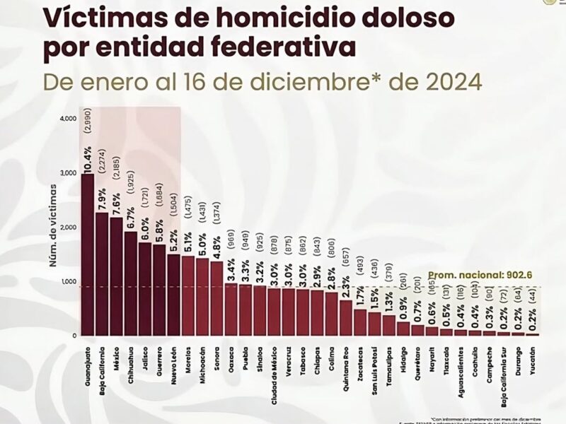 "Detienen por Homicidio de Detenido a Ex Director de la Policía Preventiva de Nombre De Dios"El estado de Durango reportó hasta este martes 17 de diciembre de 64, homicidios dolosos, que representan el 0.2% del total de los homicidios que se han registrado en el país, por lo que la entidad se mantiene como la segunda con menor cantidad de este tipo de delitos. En la conferencia matutina de la presidenta de la República Claudia Sheinbaum, se mostró la tabla estadística, en donde Durango se mantiene sólo arriba del estado…