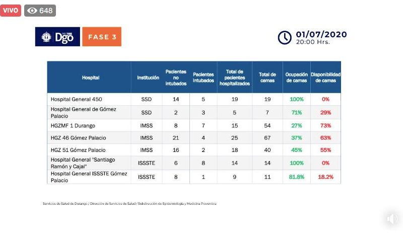 "Confirman 49 Casos de Covid-19, se Acumulan 3 Mil 115 Contagios y 251 Defunciones."El Hospital General 450 y el Hospital Santiago Ramón y Cajal se encuentran ya al 100 por ciento de su capacidad con enfermos de Covid-19, en tanto que se acumulan mil 941 casos confirmados del nuevo coronavirus de los cuales 156 han tenido desenlaces fatales, informó el Secretario de Salud, Sergio González Romero. Precisó que el Hospital General del ISSSTE en Gómez Palacio se encuentra al 81. 1 por ciento y el Hospital General del…