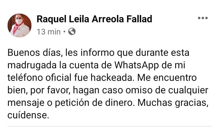 "Solo en Octubre 144 Reportes de Hackeo Preferentemente en WhatsApp: Policía Cibernética."La cuenta de WhatsApp de la Contralora del Estado, Raquel Arreola Fallad, fue hackeada durante la madrugada por delincuentes que comenzaron a enviar mensajes pidiendo dinero. Así lo informó la propia funcionaria a través de su cuenta de Facebook, donde alertó acerca de este suceso y pidió hacer caso omiso a los mensajes de los delincuentes. “Buenos días, les informo que durante esta madrugada la cuenta de WhatsApp de mi teléfono oficial fue hackeada. Me…