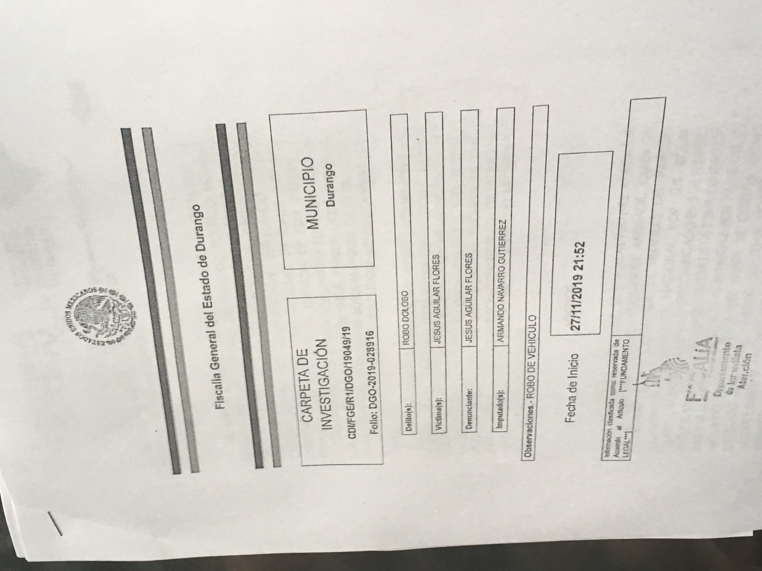 Fue interpuesta ante la Fiscalía General del Estado de Durango una denuncia penal en contra de Armando Navarro, delegado de Morena por robo de dos camionetas del partido, informó el militante Carlos Medina Alemán. Precisó que quien presenta la denuncia por el robo de dos vehículos es el licenciado Jesús Aguilar, representante legal de Morena ante el Instituto Electoral y de Participación Ciudadana. “Llega Armando Navarro en una actitud vandalica y se lleva los dos…