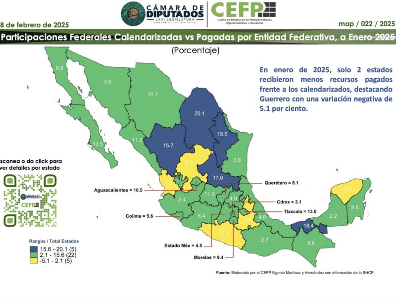 "Recibe Durango 15% Más en Participaciones en Enero; Reducen Aportaciones: CEFP"El estado de Durango fue la quinta entidad federativa con mayor ajuste en el total del gasto federalizado durante el 2024 con una disminución del 1.9%, según un documento del Centro de Estudios de las Finanzas Públicas de la Cámara de Diputados. El documento hace mención a los ingresos que tuvo el Estado durante el 2024, por concepto de participaciones federales, aportaciones federales, gasto federalizado de provisiones salariales, convenios de descentralización y reasignación, así como…