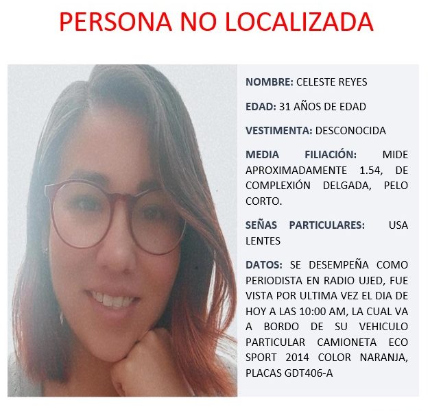 "Más de 100 mujeres duranguenses han sido parte de la Asociación Mundial de Mujeres Periodistas y Escritoras en estos 31 años."Reportan desaparición de la reportera Celeste Reyes, quien trabaja en RadioUJED, y desde hace unas horas se desconoce su paradero. Según los familiares, ella salió de su casa en la colonia Maderera esta mañana como normalmente lo hacía; viajaba en una camioneta EcoSport modelo 2014 color naranja, con placas de circulación GDT406A. Reyes se disponía a realizar su trabajo, pero nunca llegó, perdiendo comunicación con ella desde las 11:00 de la mañana. El hecho se…