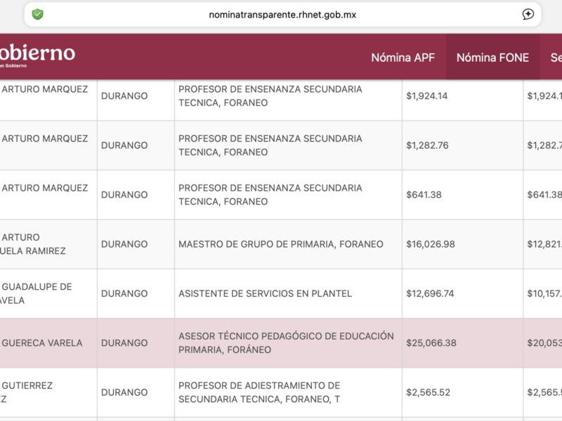 La Secretaría de Educación Pública, en su portal de transparencia de Fondo de Aportaciones para la Nómina Educativa y Gasto Operativo, FONE, mantiene como activo hasta este 15 de enero a Leonel Güereca Varela, como asesor técnico pedagógico de educación primaria, cuando desde el 1 de septiembre del año pasado se desempeña como secretario del Ayuntamiento de Santiago Papasquiaro. Durangos21 logro documentar que este servidor público aún cobró este 15 de enero hasta 25 mil…