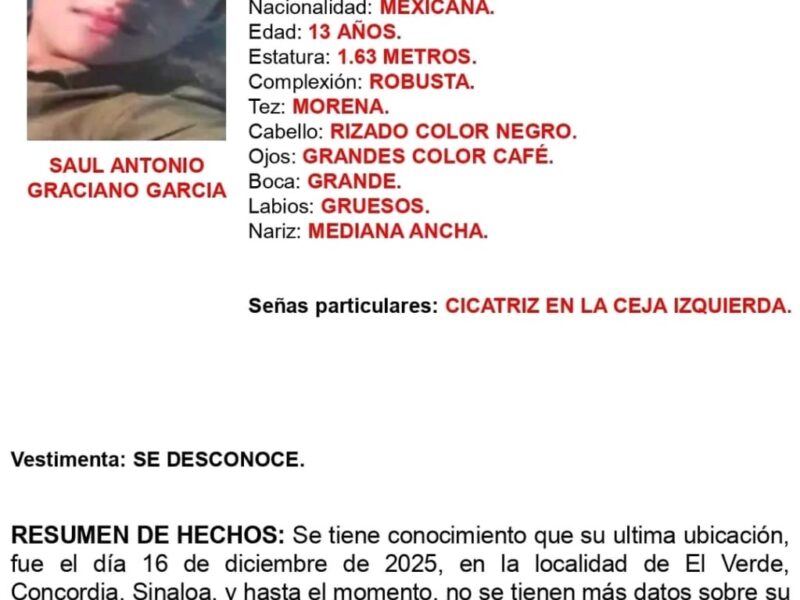 Por fin la Fiscalia General de Sinaloa lanzó la Alerta Amber, ello a casi dos meses de la denuncia de la desaparición del menor de 13 años, Antonio Graciano, quien era acompañado por su padre, de quien también se desconoce su paradero. El menor y su padre desaparecieron desde el pasado 15 de diciembre y la última ubicación que se tiene registrada en su teléfono celular es en el Verde, del municipio de Concordia. Tras…